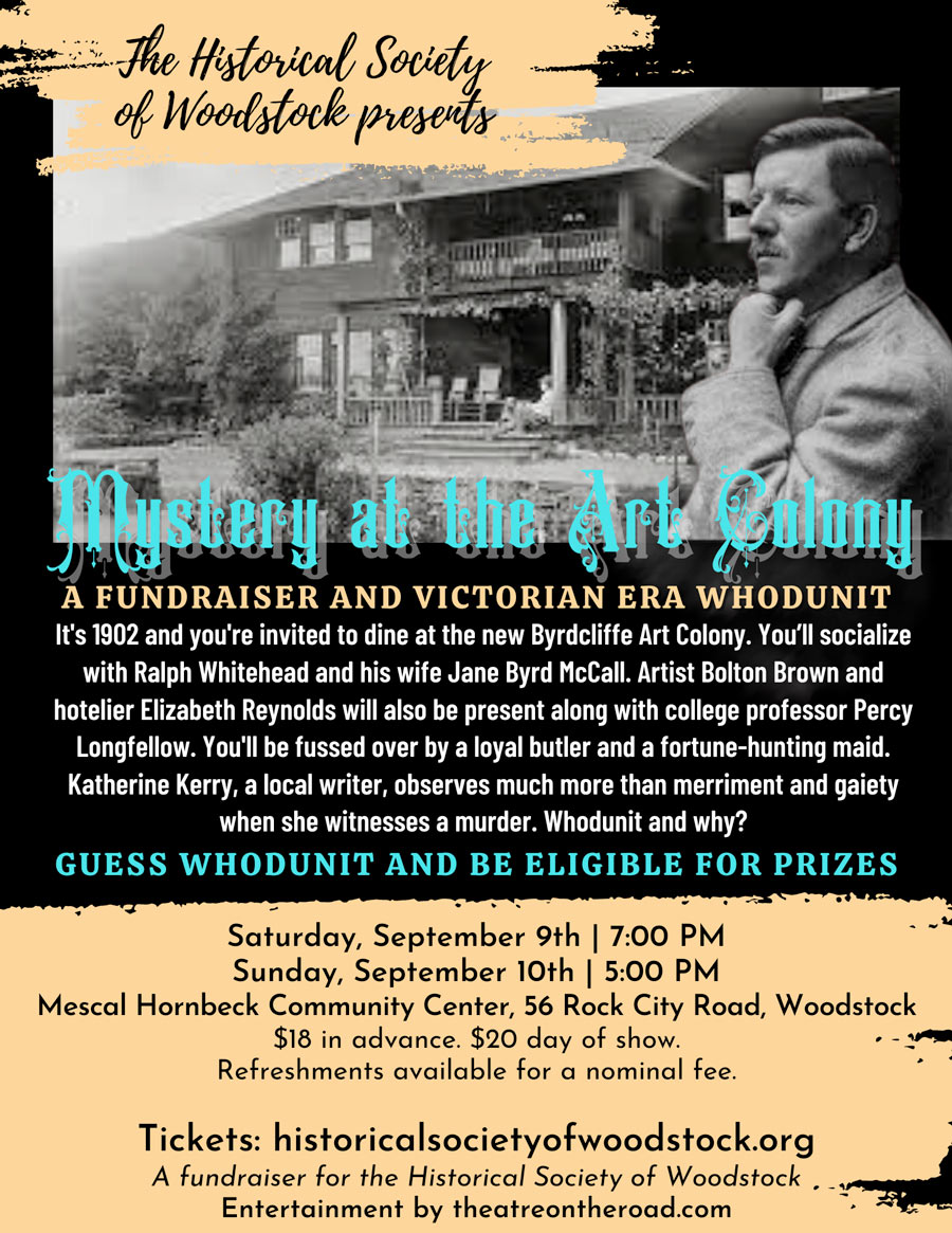 Mescal Hornbeck Community Center 56 Rock City Rd., Woodstock, NY, United StatesTo be performed as a fundraiser for the Historical Society of Woodstock It's 1902 and you're invited to dine at the new Byrdcliffe Art Colony. You’ll socialize with Ralph Whitehead and his wife Jane Byrd McCall. Artist Bolton Brown and hotelier Elizabeth Reynolds will also be present along with college professor Percy Longfellow. You'll be […]
